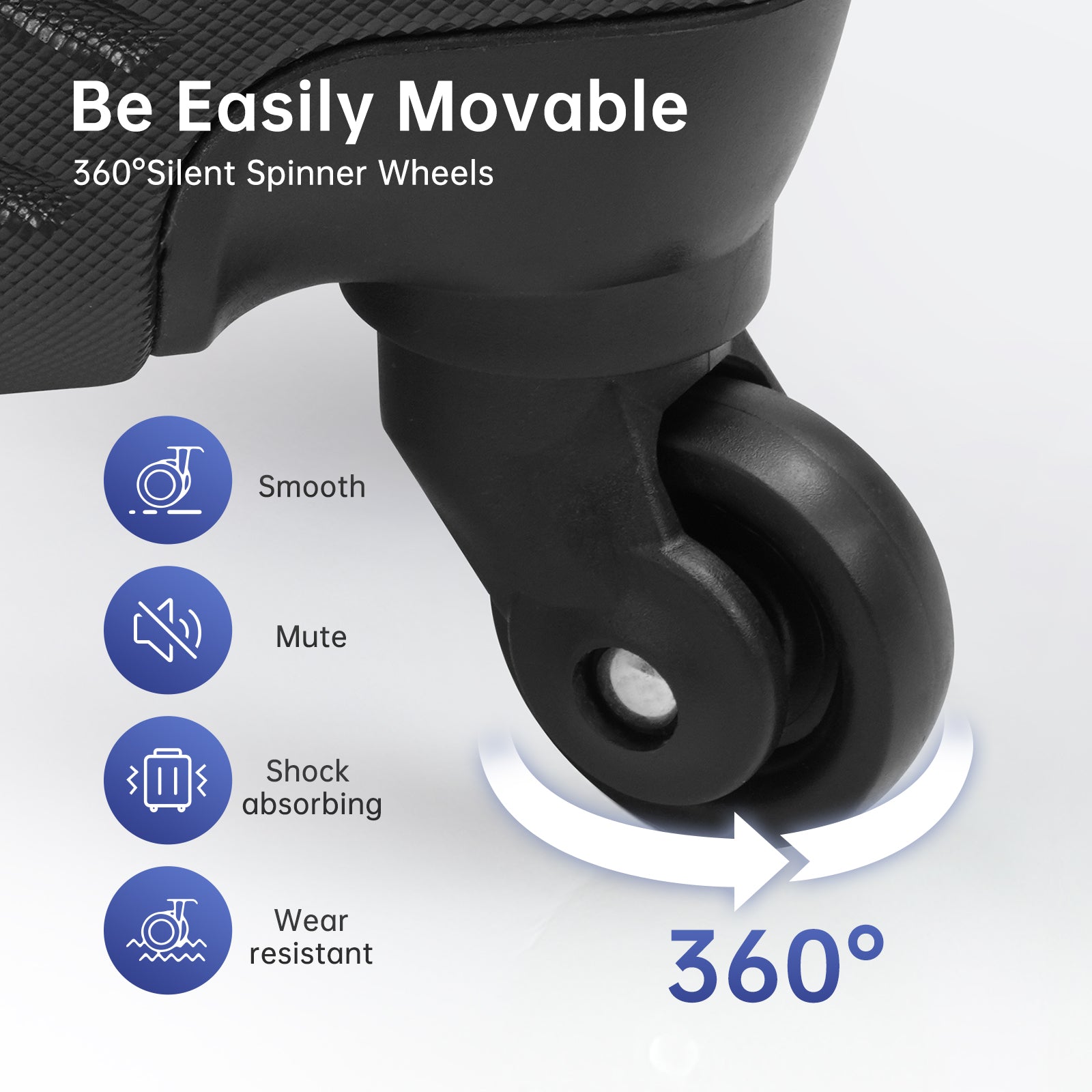 【360 degree Spinner Wheels】This 3-piece hardside luggage set features 360-degree silent rolling wheels that ensure maximum smoothness and quiet movement. Multi-directional spinner wheels make it easy to navigate through crowded airports and tight spaces.