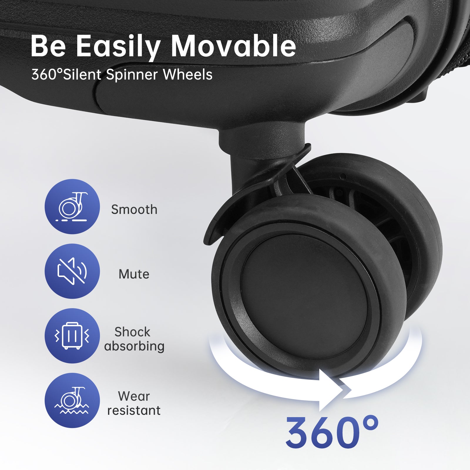 【360 degree Spinner Wheels】This 5-piece hardside luggage set features 360-degree silent rolling wheels that ensure maximum smoothness and quiet movement. Multi-directional spinner wheels make it easy to navigate through crowded airports and tight spaces.