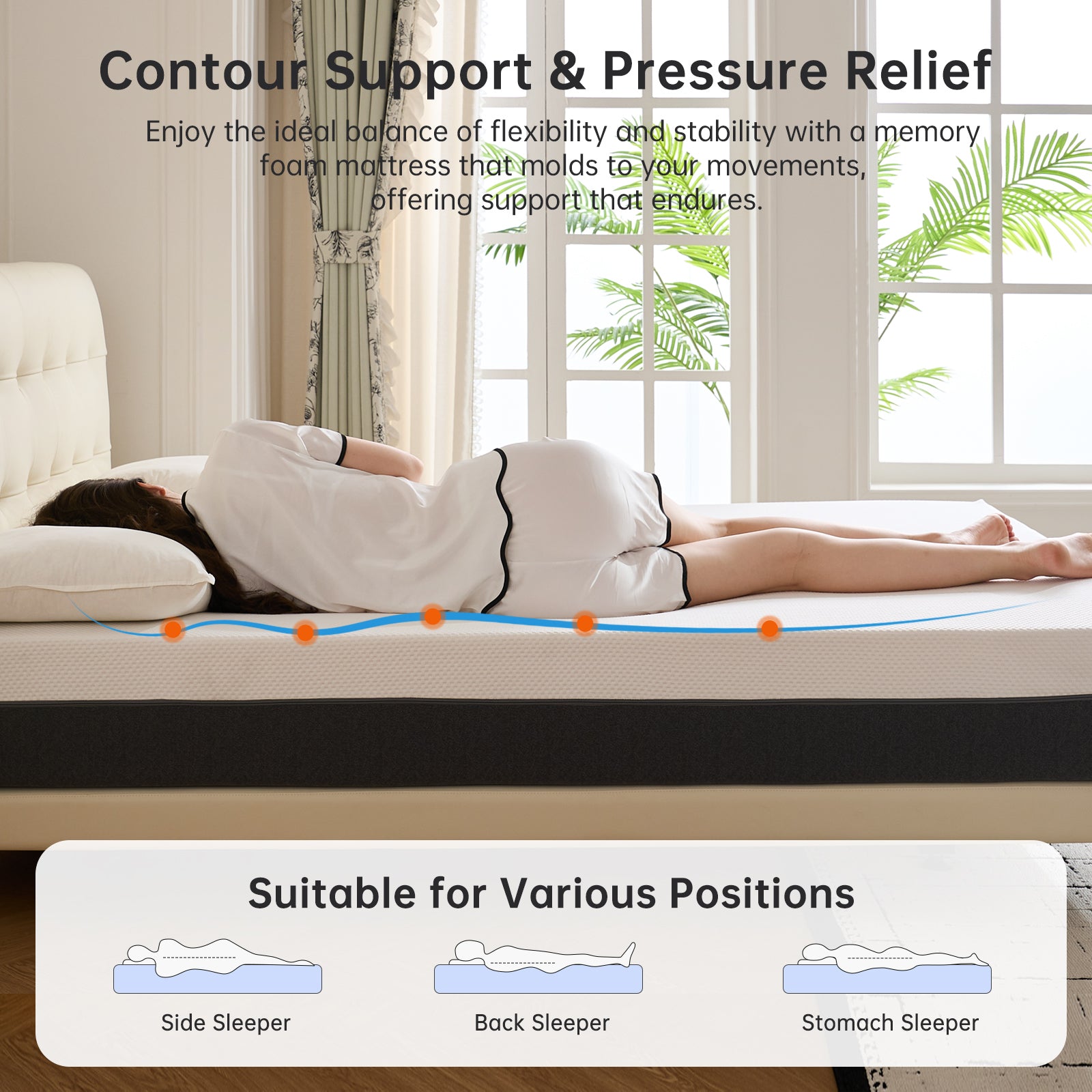 【Luxurious Memory Foam Core】 The twin mattress is crafted with high-quality memory foam that adapts to your body's curves and weight distribution, providing balanced support. It relieves pressure points on shoulders, lumbar, hips, and back for a comfortable, refreshed sleep without excessive sinkage.